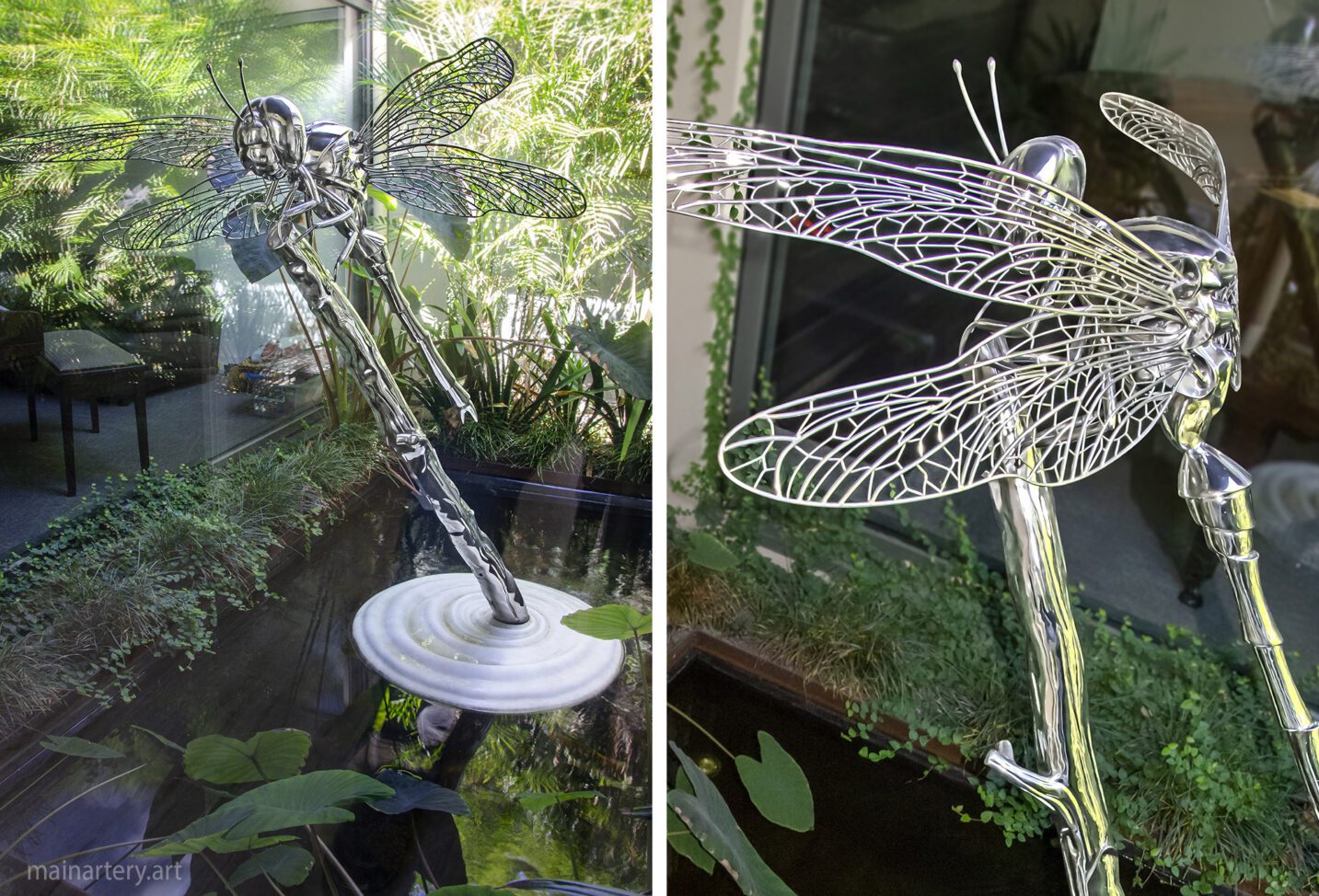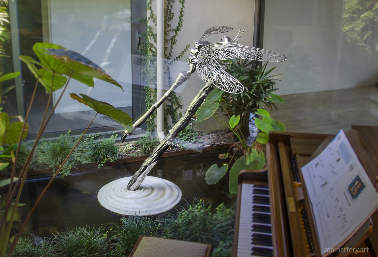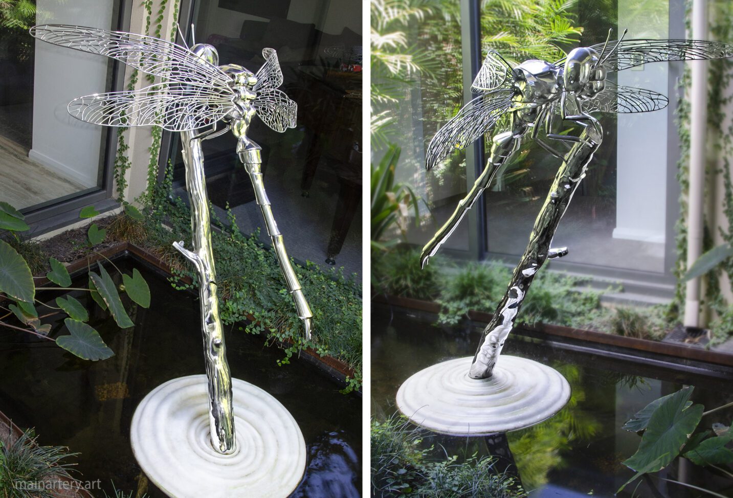 “We recently completed the new built of our dream architectural home. Integral to the design is a key feature & Central Atrium that creates a center point of focus within. For us it was really important to highlight something of significance in this space and after searching long & hard were fortunate enough to find Todd Stuart’s Dragonfly water feature sculpture. To us it adds a statement of masterful artisanship & perfection, but also in its physical meaning & tribute to beauty it brings from outside in nature to be a modern display inside our home. The sense it brings is that of Living around nature all the time, which is natural and feels good to the soul!”